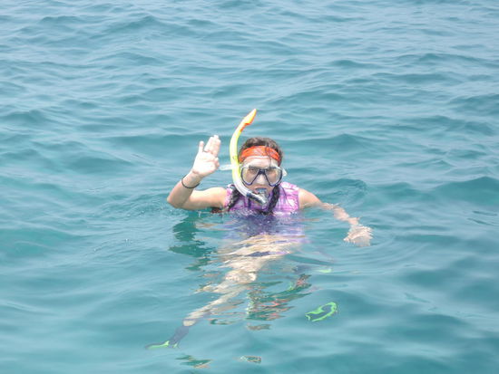 Enttäuscht werden wir nicht, obwohl die Spuren des Korallensterbens von 2010 leider schon noch zu sehen sind.Viele kleine bis auch etwas größere sehr bunte Fischilein sind dennoch zu bewundern. Ja, auch Nemo ist da! Martin sieht sogar einen 1m großen Hai, und spielt dann vor einem Strand mit den gar nicht scheuen kleinen Riffhaien. Der Arme hat ja auch grad keine anderen Spielkameraden Eine besonders tolle Sicht mit blauen Abgründen bietet ein weiterer wunderschöner Schnorchelspot bei einer Felsformation.