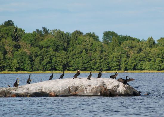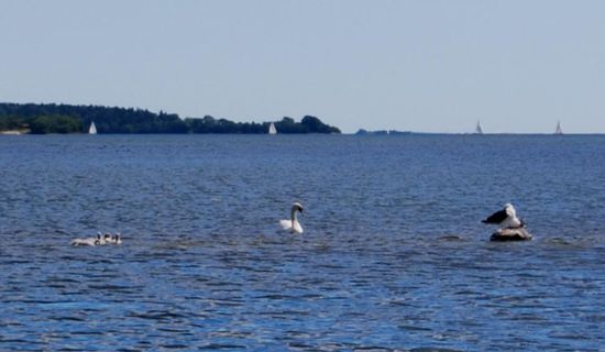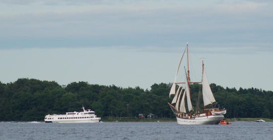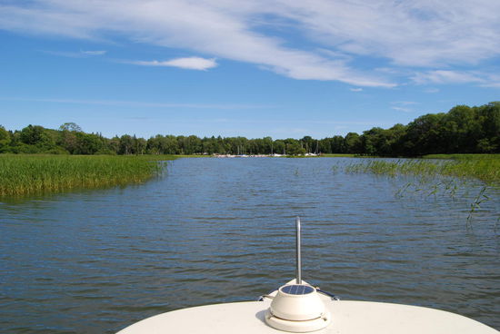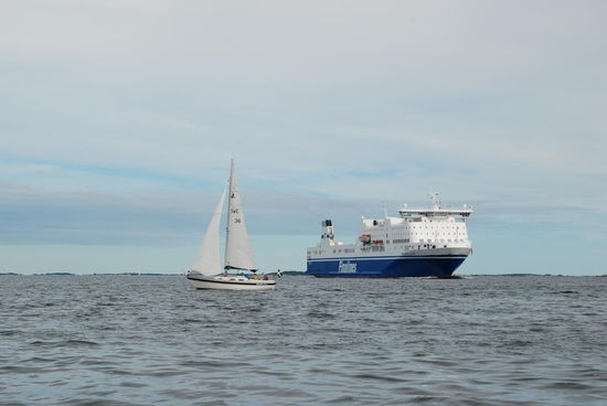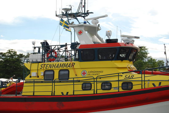 Am nächsten Tag fuhren wir zurück zu unserer Einsatzstelle. An einem kleinen Hafen machten wir noch eine Pause mitten im Schilf, in dem sich viele Haubentaucher tummelten. Dann ging es weiter am Fährhafen Kapellskär vorbei, der gerade von einer großen Fähre angelaufen wurde. In Rävsnäs liegt eine Station der schwedischen Seenotrettungsgesellschaft, wo wir uns die Rettungseinheiten ansahen. Hier sahen wir sogar einen Behindertenbootsplatz!