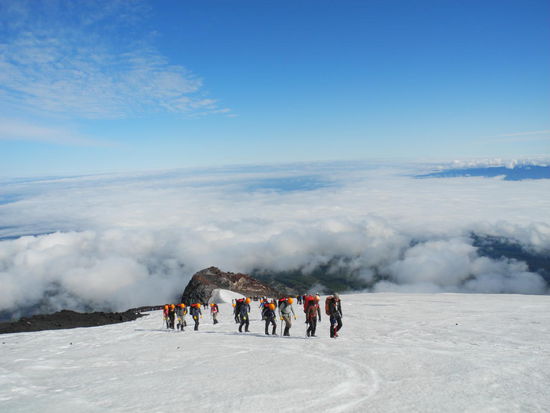 Der Aufstieg geht zu Beginn über Lavagestein bis zu den Schneefeldern. Die letzten 500 Höhenmeter sind die schwierigsten, da recht steil und glatt, wir sind froh über den Eispickel.