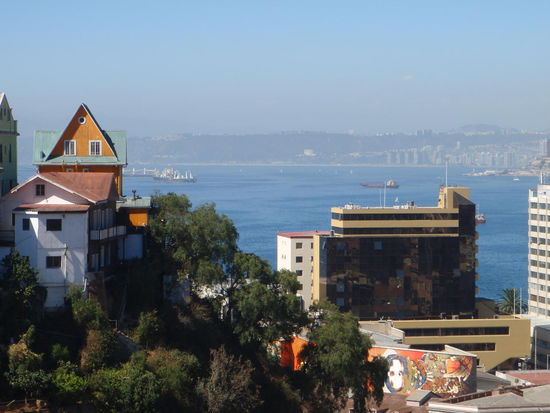Wir haben von unserem Hotel aus eine tolle Aussicht auf den Hafen und die Bucht von Valparaiso. Die Stadt lebt am Wasser sie zieht sich am schmalen Uferstreifen entlang und dann auf viele besiedelte steil aufragende Hügel hinauf.