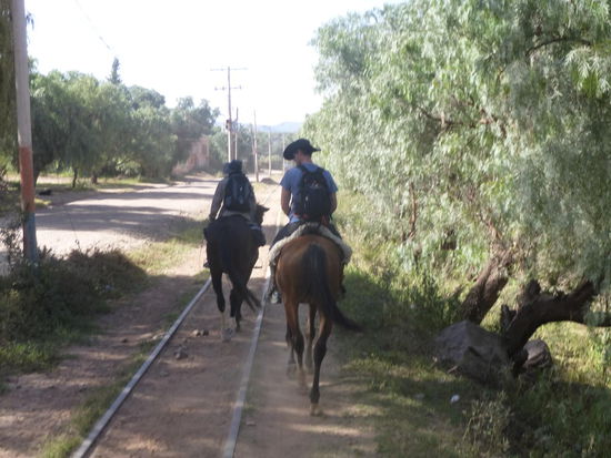 Da wir weiter auf der Straße geblieben sind, haben wir bald wieder Tupiza erreicht. Im Ort sind wir die Bahngleise, auf denen nur sehr selten Züge fahren, entlang geritten. Aus einem mir unerfindlichen Grund wollte mich mein Pferd auf einmal los werden und so habe ich eine mehr oder weniger elegante Rolle über den Hals der Stute gemacht. Zum Glück blieb es bei ein paar Schürfwunden und einem partiell tauben Knie.