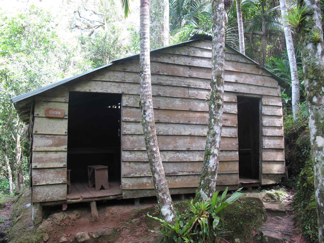 Der Weg führte uns zwar meistens im Schatten bergauf, doch wie ich schon erwähnte kamen wir trotzdem gut ins schwitzen. Die Comandancia la Plata oder auch Comandancia General de La Plata mußte hier oben bzw. schwer zu finden sein, denn es war schließlich das Hauptquartier der Revolutionäre um Fidel Castro in der kubanischen Revolution. Nachdem sie mit der Granma gelandet sind haben sie sich hier oben in 16 verschiedenen Hütten versteckt und die Revolution geleitet. Dazu gehörten eine Küche, ein "Krankenhaus", eine Waffenkammer, ein "Kriegsgericht" und die Radiostation Radio Rebelde. Diese liegt allerdings ein wenig abseits, noch ein gutes Stück weiter den Berg hinauf. Wir sind nicht bis zu ihr gelaufen.