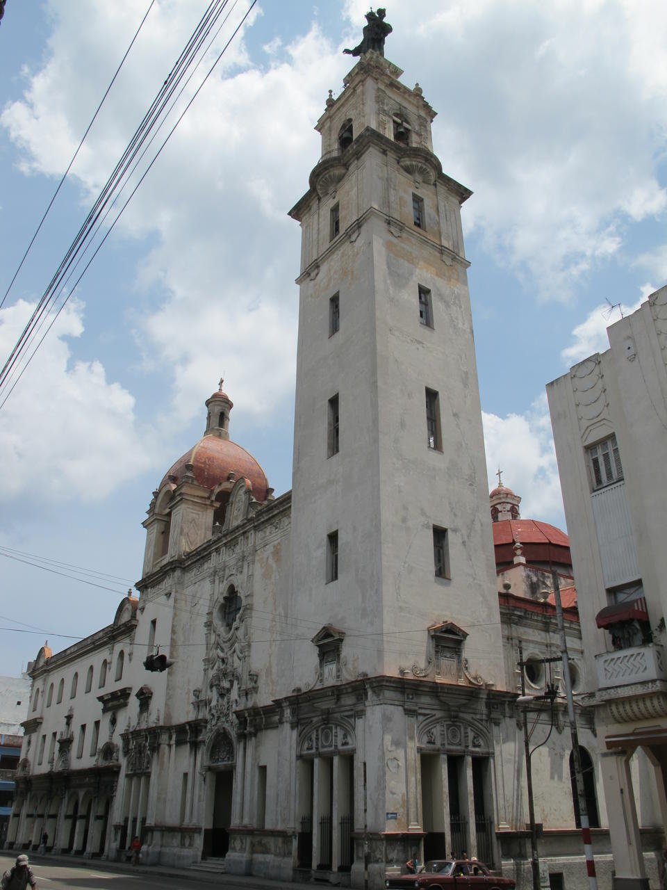Am Capitolio Nacional vorbei gings nochmal kurz durch den Parque de la Fraternidad, doch diesmal nicht wieder hinter dem Capitolio Nacional zurück Richtung Hotel, sondern weiter auf der Av Simon Bolivar Richtung Westen. Die Straße sind wir auch scho am Ankunftstag mit dem Taxi entlang gefahren, da auch der Flughafen Richtung Westen liegt. Doch zu diesem wollten wir net, noch net, des hat noch zwei Wochen Zeit... Die Av Simon Bolivar ist nach einem südamerikanischen Unabhängigkeitskämpfer der in vielen südamerikanischen Ländern ein Nationalheld ist benannt. An ihr liegen fast nur Häuser an denen man im Erdgeschoß wunderbar durch überdachte Bogengänge entlang laufen konnte. Dies war bei der Sonne sehr angenehm. Wir wagten uns raus aus den Bogengängen als wir zu Iglesia Del Sagrado Corazon de Jesus kamen, denn diese lag auf der anderen Straßenseite. Leider kann man die schöne Vorderseite der Kirche nicht optimal aufs Foto bekommen, noch dazu war vor der Kirche eine Baustelle. Beim Abstecher in die Kirche machte ich bzw. versuchte ich ein Foto des Innenraumes zu machen. Aber da wurde ich auch scho von einer Kubanerin angelabert, welche ich ignorierte und wir gleich wieder raus sind. Dafür hab ich keinen Bock was zu zahlen...
