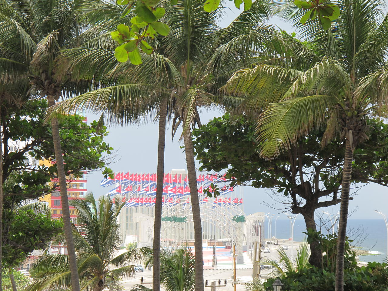 Bevor wir wieder zum Malecon und damit an die Floridastraße sind, machten wir noch einen letzten Abstecher zum Hotel Habana Libre, Havannas größtem Hotel. Es hieß früher Havana Hotel und wurde 1958 am Vorabend des letzten Walzers von Batista eröffnet. Damals gehörte es zur Hilton Kette etz zu den spanischen Tryp Hotels. Im Januar 1959 wurde es von Castro beschlagnahmt und er regierte das Land eine Zeit lang aus seiner Suite im 24. Stockwerk. Im LP wurde das 670 Quadratmeter große Wandmosaik von Amelia Pelaez aus venezianischen Fließen an der Außenfront erwähnt, weswegen ich hauptsächlich hin wollte. Ich kann sagen muß man net wirklich gesehen haben. Vorbei an einem ziemlich alten Kino gings weng durchs Wohngebiet und bei purem Sonnenschein zum Plaza Tribuna Anti-Imperialista und den 138 kubanischen Flaggen. Es gibt mehrere Theorien warum die 138 Masten mit den kubanischen Flaggen aufgestellt wurden, ein davon ist diese. Hinter den Masten ist die Interessensvertretung der USA (keine Botschaft), an der eine Leuchttafel angebracht ist, die genutzt wird um Stimmung gegen Castro zu machen. Und um diese zu verdecken wurden die Masten errichtet und die Flaggen gehisst.