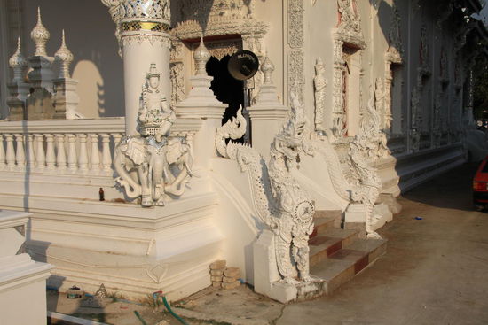 Dann mache ich mich eben auf den Weg in den Ort Richtung Fluss. An der Rezeption bekomme ich noch einen Stadtplan der besser ist als der Kleine im Handbuch. Es sollte gar nicht so weit sein. Die Straße, die ich lang muss ist allerdings ewig breit Und kaum bebaut. Deshalb zieht sich das Ganze. Dann geht es rechts eine genauso breite Straße weiter. Dann sehe ich aber schon den Glockenturm, der den Beginn der Altstadt markiert. Gleich darauf, Richtung Fluss, stoße ich auch schon auf den ersten wunderschönen Tempel. Er ist nicht sehr groß und außen nur in Weiß und Gold mit vielen Glasblättchen verziert. Die Hauptverzierung besteht aber in feinen Stuckarbeiten, Die Einfahrt vorne wird gerade gerichtet so wie wohl überall an den Tempel gearbeitet wird, Ich weiß auch nicht, ob er noch ziemlich neu oder gerade generalüberholt worden ist. Jedenfalls bin ich begeistert.