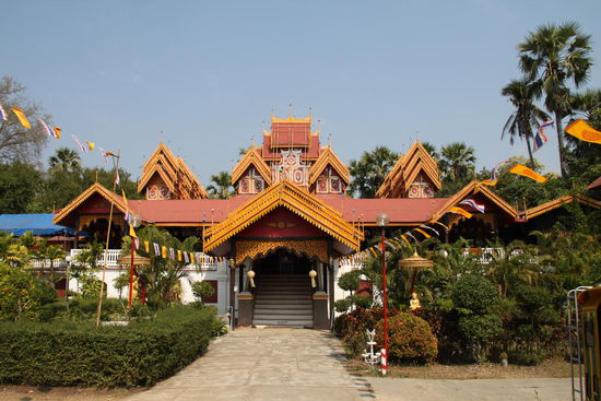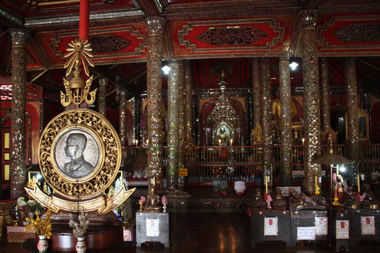 Wieder bei meinem "Taxi" meine ich, dass er mich jetzt irgendwo in der "Altstadt" absetzen kann, aber mein Fahrer sieht das anders und meint, er muss mir erst noch einen "Beautiful Tempel" zeigen. Na dann, mal sehen wie sich das im Fahrpreis niederschlägt. Wir fahren wieder über den Fluss, dann aber nicht links rum Richtung Innenstadt, sondern nach rechts. Nach einer Weile hält er an einem Tempel, wie ich ihn tatsächlich so noch nie gesehen habe. Er hat irgendwie gar nicht die gewohnte Bauweise der Tempel, ist ganz aus Holz gebaut und in der Tat sehr schön. Mein Fahrer fragt mich ganz stolz "Beautiful". Ich bestätige ihm das gerne. Innen ist ganz viel mit Glaseinlegearbeiten gearbeitet worden was auch richtig toll wirkt.