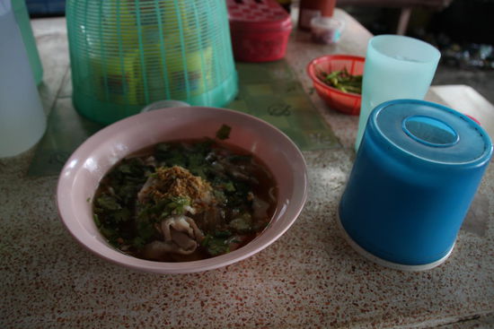 Diesmal brauchen wir 3,5 Stunden. Um 13:30 sind wir in Udon. Mit mir im selben Bus sitzt auch ein französisches Paar. Auch die beiden wollen nach Nong Khai. Wir werden zu einem Minibus geschickt. Der Fahrer will 50 B was ja ok wäre, aber dann noch einmal 50 B für meinen Koffer. Ich lehne ab und frage, wo der öffentliche Bus steht. Der deutet auf den Bussteig gegenüber. Der Bus soll um 14:00 fahren und kostet 40 B ohne Zuschläge. Das passt doch. Die beiden Franzosen beobachten das und machen es mir dann nach. 30 Minuten Wartezeit, das passt prima, um eine Nudelsuppe essen zu gehen. Der Stand 30 Meter weg macht einen guten Eindruck. In der Tat ist die Suppe prima. 50 B sind zwar etwas mehr als ich gewohnt bin, aber die Suppe war es alle male wert.