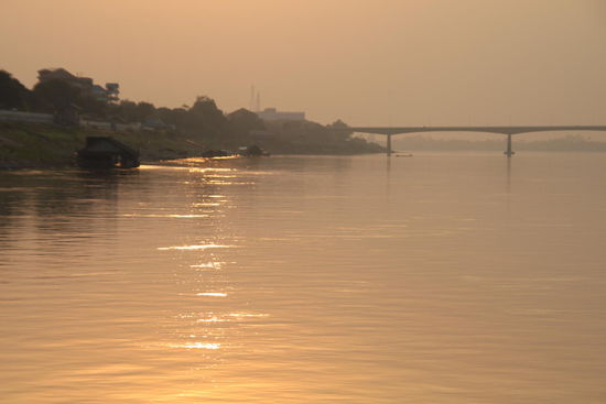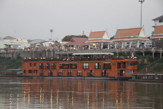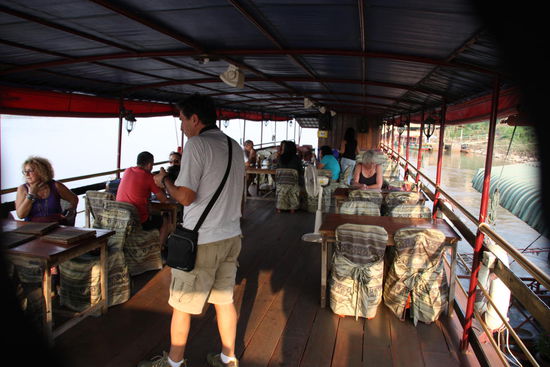 Zum Gästehaus gehört ein Restaurant das die meiste Zeit gut besucht ist von den Leuten die hier wohnen (weil vermutlich die Zimmer nicht dazu verleiten, sich länger als nötig dort aufzuhalten) und ein Bar auf einem Boot im Mekong das vor dem Gästehaus vor Anker liegt. An dem Boot wiederum ist das Boot festgemacht, mit dem die Mekongfahrt gemacht wird. Ich sammle Nell ein nachdem ich sehe, dass drei weitere Gäste zum Boot runter geschickt werden. Wir sind 11 Leute und damit findet die Fahrt statt. Das Boot ist erstaunlich groß und mit Tischen und bequemen Polsterstühlen ausgestattet. Man kann während der Stunde Fahrtzeit auch zu Abend essen. Wir trinke aber nur jeder ein Bier und genießen den Sonnenuntergang. Die Fahrt kostet nur 100 B, ist aber auch nicht mehr wert. Der Mekong ist hier so zugemauert, dass die Sicht zum Ufer nicht besonders ansprechend ist. Da ist die Fahrt die oben in Luang Prabang in Laos angeboten wird interessanter.