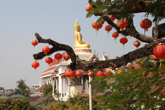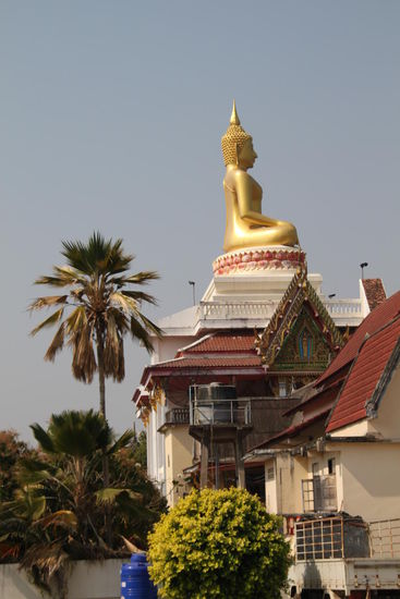 Zurück am Mut Mee ist das Tuktuk weg. Dafür steht auf der anderen Straßenseite einer der Roller und Fahrräder vermietet und noch zwei Roller da stehen hat. Ich hole meinen Rucksack und Nell ab und erzähle ihr, was ich vorhin ausgemacht habe. Wir warten bis kurz nach 10:00, dann leihen wir uns die beiden Roller. Als erstes fahren wir zum Wat Lam Deun, einem Tempel am Mekong, bei dem eine Buddha Statue auf einem Gebäude sitzt auf das man über steile Treppen rauf kann. Von hier hat man einen netten Blick auf Nong Khai.