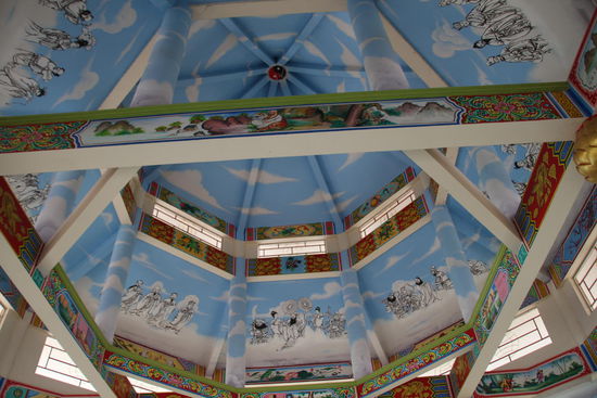 Direkt daneben gibt es eine chinesische Pagode, die auch recht reizvoll aussieht. Vor allem ist sie innen mit überwiegend hellen Blautönen ausgemalt statt dem üblich vorherrschenden Rot und Gold.