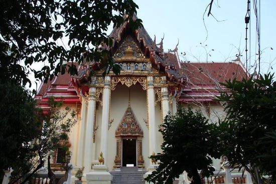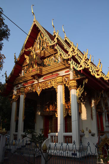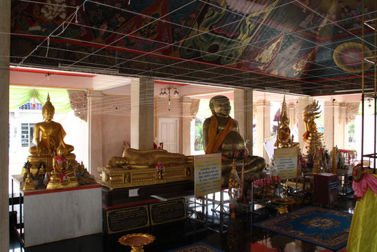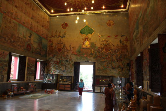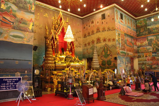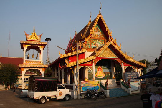noch einmal die beiden von heute Morgen wegen besserem Fotolicht und den Haupttempel von Nong Khai, den War Po Chai zu besichtigen. Der Po Chai ist alleine wegen seiner Größe beeindruckend und innen toll mit unzähligen kleineren Gemälden verziert.