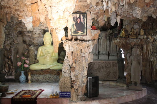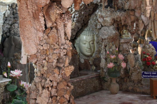 Dann halte ich wegen dem schönen Licht noch einmal am Wat Sakae. Wieder beim Wat Payab folge ich diesmal dem Wegweiser zur Höhle richtig und lande vor einem kleinen Bauwerk dessen Tür auf geht und ein wenig nach Thai aussehender Mönch öffnet mir. Tatsächlich kommt er aus Düsseldorf, lebt seit sechs Jahren hier im Tempel und fängt jetzt an der Buddhistischen Universität an zu studieren. Leider habe ich seinen Namen wieder vergessen. Er erzählt mir die Geschichte der Höhle, die vor etwa 20 Jahren zwischen Santaburi und Lopburi beim Zementabbau entdeckt worden ist. Der Chef der Firma erzählte das dem hiesigen Abt, der reiste hin und war überzeugt, dass man diese Höhle vor der Vernichtung retten sollte. Vier Jahre lang ist die Höhle abgebaut und so wie heute zu sehen hier wieder aufgebaut worden und jetzt so etwas wie das besondere Wahrzeichen des Tempels.