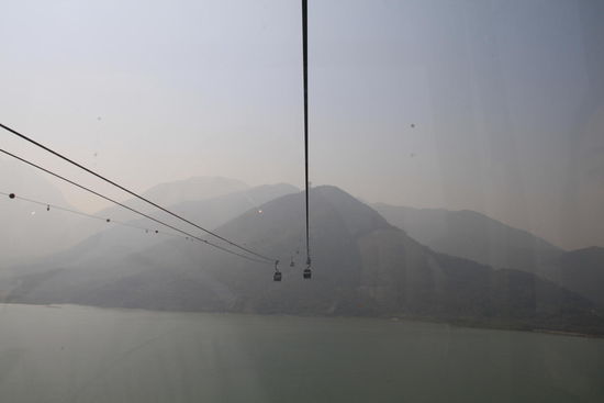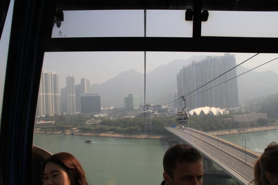 Direkt neben dem Endbahnhof befindet sich die neue Seilbahn Ngong Ping 360, die zum Kloster rauffährt. Es geht über zwei Umlenkstationen rund 20 Minuten nach oben - wenn man dann mal ein einer Kabine sitzt. Der Platz zwischen Metro und Seilbahn ist so gut wie leer. Auch in der Schlange vor der Kasse ist nicht zu viel los. Glasboden zu wählen. Da ist zwar etwas teurer, aber sicherlich spannend.