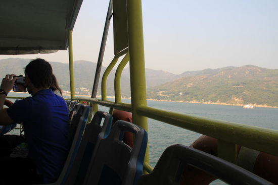 Nach Mui Wo geht es quer durch Lan Tau durch einen schöne Landschaft. Von hier startet die Fähre nach Central. Damit habe ich die Rundreise für heute geschlossen. Das Boardingschild hängt schon da, aber nachdem ich durch das Drehkreuz bin habe ich gesehen, dass es wohl doch noch etwas dauert. Da hätte ich noch schnell nach dem Gemarkungsstein der Familie Li schauen können. Egal, 10 Minuten später etwa war die Fähre da. Sie ist etwas größer und hinten offen so dass man draußen sitzen kann. Die Fahrt geht eine gute halbe Stunde und ist bei dem schönen Wetter wieder eine Freude.
