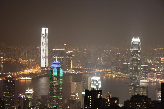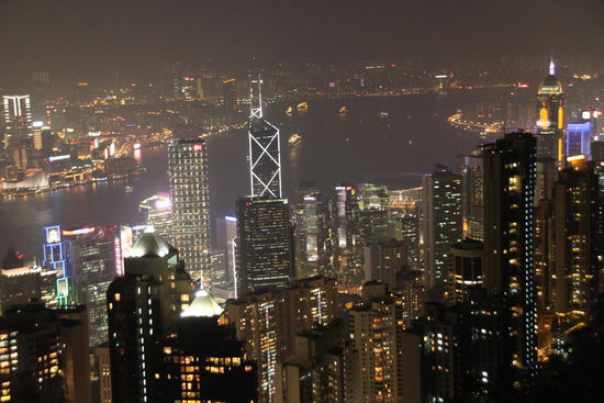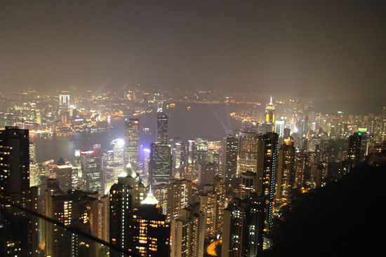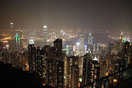 Jetzt fahre ich mit dem einfach wieder zum Hafen runter und suche Bus Nr. 15. Der kam auch 5 Minuten später und für 10 $ bin ich auf den Peak hochgefahren. Der Bus hält wieder in einer Art Busbahnhof unter einem Shoppingcenter. Also da erst einmal so weit wie möglich nach oben. Dort gibt es tatsächlich eine frei zugängliche Terrasse. Komisch, das soll alles an Aussicht sein? Dafür diese riesen Terrasse? Es dauert eine Weile, bis ich bemerke, dass ich mich sozusagen auf der Rückseite des Gebäudes befinde. Nach vorne hin sieht es schon wesentlich besser aus. Hier sieht man auch das Gebäude nebenan mit der Aussichtsterrasse, von der aus der Blick noch besser sei könnte. Also wieder runter, über einen kleinen Platz (Hier sieht man auch wieder die Massen, die auf die Tram warten.) und in das Nachbargebäude. Anders als drüben wollen sie hier 40 $ Eintritt für die Terrasse. Als sie dann noch meint, dass ich das Stativ nicht benutzen darf, weil es zu voll ist, lehne ich erst einmal empört ab und gehe. Allerdings überlege ich es mir gleich wieder, drehe und zahle den Eintritt - wenn ich schon einmal da bin. Außerdem mal sehnen ob ich nicht vielleicht doch irgendwie mit Stativ fotografieren kann. Oben angekommen zeigt sich dann, dass alle die ein Stativ dabei haben, es auch einsetzen. Im Übrigen brauchen viele von denen die mit ihren Handys knipsen mehr und länger den Platz am Geländer als ich mit meinem Stativ. Die Aussicht ist grandios. Ich finde den Blick noch besser als den zur Lightshow von Kowloon aus.