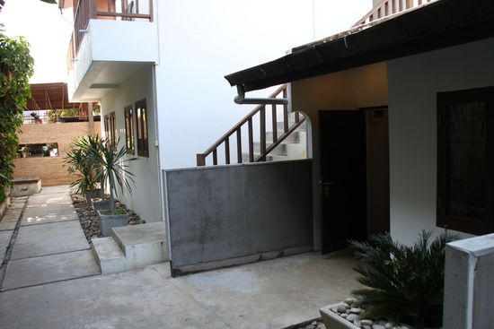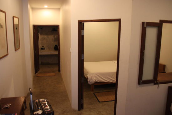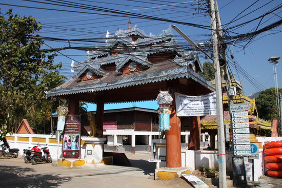 Etwa 4 Stunden später sind wir in Pai. Ich hole mein Pad raus rufe, mein Know How auf und schaue mir den Stadtplan an. Pai ist ja nur ein kleines Nest und so fällt die Orientierung anhand von Gästehäusern u.ä. recht einfach, Die beiden Amerikanerinnen stehen etwas hilflos herum. Der Typ am Fahrkartenschalter hat ihnen auch nicht weiter geholfen. Ich frage wo sie hin müssen. Die Mutter sieht den Plan und meint zu ihrer Tochter "Schau, er hat Internet." Ich daraufhin "Nein, nein, das ist nur ein Reisehandbuch, das ich mir auf meinen Pad geladen habe. Ihr Hotel ist auch eingezeichnet, so kann ich ihnen weiter helfen. Wir verabschieden uns "Vielleicht sieht man sich heute Abend. So groß ist der Ort ja nicht. Ich gehe zum Lilu Hotel. Das befindet sich außerhalb des "Fußgängerbereichs". Ich habe kein Zimmer, sondern eine Art Reihenbungalow. Der ist mit Sichtbeton und Betonboden ziemlich modern, aber meiner Meinung nach eher ungemütlich gestaltet. Das Schlafzimmer ist sozusagen nach Innen verlegt und hat ein Fenster das in den "Wohnraum" zeigt, Was leider gar nicht geht ist das ziemlich fleckig schmutzige Sofa im Wohnraum.
