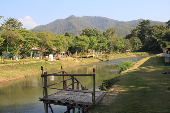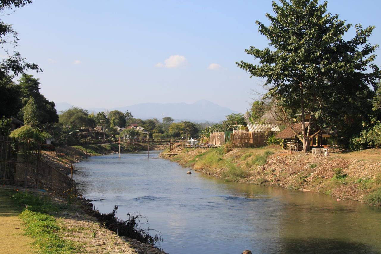 Am Ende dann wartet der Wan, ein kleines Flüsschen, über das hier eine Bambusfußgängerbrücke führt. Auf der anderen Seite gibt es dann noch einmal ein paar Bungalowunterkünfte. Auf "unserer" Seite rechts der Gasse befindet sich eine etwas gehobenere Bungalowanlage. Zu ihr gehört ein Open Air Restaurant. Hier verbringe ich den Mittag, trinke tatsächlich einmal tagsüber ein kleines Bier und genieße die Landschaft. Genau hier kann ich nachvollziehen, was die ersten Traveller an diesem Ort wohl gefunden haben. So toll finde ich ihn landschaftlich nämlich nicht gerade und sonst erst recht nicht. Da gibt es weitaus reizvollere wie beispielsweise Vang Viang in Laos oder ein kleines Nest in Kerala in Südindien mit einem interessanten Klippenpfad dessen Name mir gerade nicht einfällt.