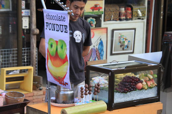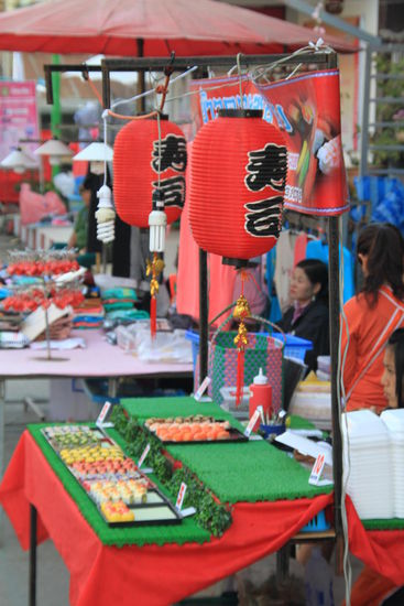 Ziemlich crazy - Gyoza und Okonomiyaki, also Urjapanisches Essen auf dem Nachtmarkt in Pai. Aber es gibt ja auch Sushi und Schokoladenfondue.