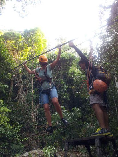 Gestern haben wir eine Insel hopping Tour gemacht, wobei wir einen ersten Stop am Süsswassersee machten. Hier war es wirklich schön, wir bestaunten viele Affen und schwammen bei sagenhafter Kulisse. Der nächste Stop sollte eine traumhafte Insel zum schnorcheln sein, die Insel kam das traumhafte hatten wir leider verpasst. Hier war es Menschen überfüllt und Fische musste man sich vorstellen um welche zu sehen. Egal dafür hatten wir heute eine gigantische Dschungle-Tour. Aber eine für richtige Füchse, nämlich mit Hochseilgarten. Hier waren wir wie Tarzan und Jane, kletterten auf Bäumen, überwunden Schluchten, schwangen via Zip line von A nach B, saßen wie Affen im Baum und kletterten 40m hohe Felsen und Bäume einfach so mit einem Seil runter. Ein sehr gelungener Tag, kein warten znd sogar trotz kleiner gebuchten Tour eibe grosse Geschenkt bekommen