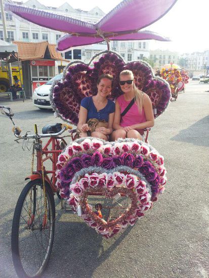 Eingestiegen, gefahren, gehalten und jetzt? Achso Passkontrolle. Alle raus aus dem Bus zur Passkontrolle und wieder rein in den Bus....schön wärs. Wir mussten nicht warten ( was sonst schon mal gerne hier der Fall ist) nein, sie wollten Theresa nicht durch lassen, weil sie ihr Visum verlegt hatte...ups....kleiner Panikanfall bei ihr "schnell" ein neues Visum ausfüllen und weiter. Was uns keiner sagte, nach 5 Minuten hieß es wieder raus aus dem Bus und zur Passkontrolle mit ALLEN sieben Sachen zur Durchleuchtung. Nach einer angenehmen Weiterfahrt wurde diese wieder unterbrochen durch eine Pippipause.....nur das wir nie wissen was los ist irgendwie redet keiner mit uns. Als wir am Ziel ankamen wussten wir dieses auch erst, nachdem uns zwei nette Indonesierinnen darauf aufmerksam gemacht haben. Diese waren auch so nett und nahmen uns an die Hand brachten uns in die City von Melaka und besorgten uns sogar ein Zimmer....dieses ist naja....anders würde passen, aber ist einfach nur wieder eine Umstellung. Melaka wurde direkt unsicher gemacht per Fuß und per Fahrradtaxi, sogar eine Massage war drin