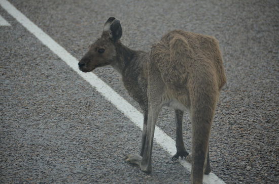 Als wir grad so weiter durch die australische Prärie fahren, erblicken wir in der Ferne etwas auf der Strasse. Beim Näherfahren stellen wir fest, dass es ein Känguru ist, das genüsslich den Mittelstreifen abschleckt. Das ist ja ulkig! Noch ulkiger ist die Tatsache, dass das Tierchen nicht daran denkt den Highway zu verlassen, obwohl unser grosses Gefährt immer näher und näher kommt. Ein paar Meter vor unserem tierischen Freund bremst Jürg und das australische Beuteltier denkt immer noch nicht daran Platz zu machen. Na der hat Nerven...