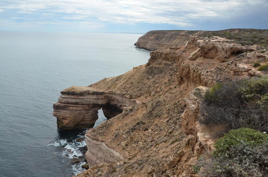 Gegen Mittag erreichen wir die Grenze des Kalbarri Nationalparks, jedenfalls den Teil, der am Meer liegt. Wir biegen von der Nebenstrasse ab und besuchen den ersten Punkt, die Natural Bridge. Wie auf Kommando verdrückt sich die Wolkendecke und warmer Sonnenschein verwöhnt uns. Da kommt Freude auf!