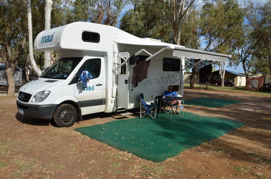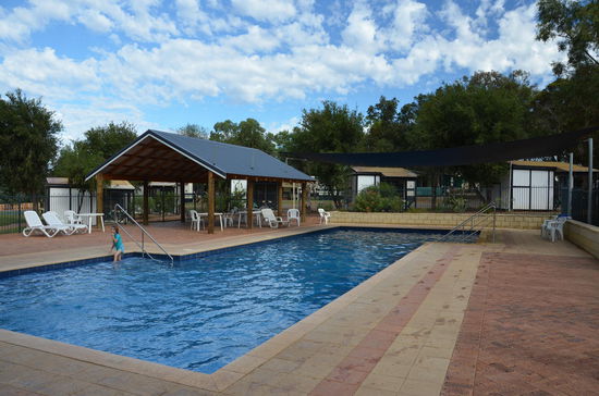 Etwas müde und verschwitzt erreichen wir unseren heutigen Übernachtungsplatz, den Kalbarri Tudor Holidaypark. Unter hohen schattenspendenden Eukalyptusbäumen erhalten wir einen schönen Standplatz. Das Strässchen hat sogar einen Namen: Fifth Avenue. Wer sagt's denn... vornehm geht die Welt zugrunde! Unser Platz hat nicht nur einen angenehmen künstlichen Rasenteppich sondern auch ein Badehäuschen. Sehr praktisch! Doch noch mehr gefällt uns der schöne Swimmingpool. Schnell werfe ich mich ins Badekleid und geniesse das kühle Wasser. Viele australische Swimmingpools haben einen Teil durch ein grosses Zeltdach gedeckt. Gerade wenn die Sonne erbarmungslos herunterbrennt, ist dies höchst angenehm. Es ist weit über 30 Grad und auch Jürg sitzt schon bald im Pool und geniesst das kühle Nass. Einfach herrlich.