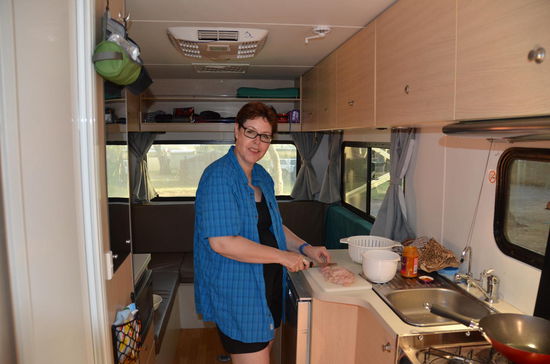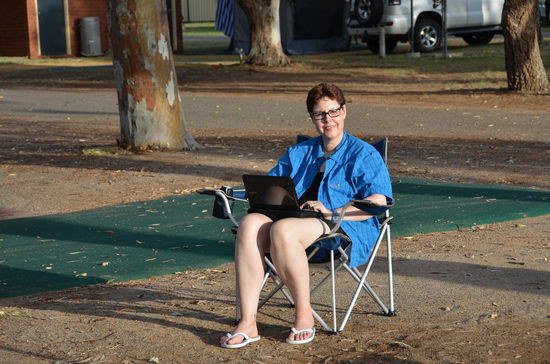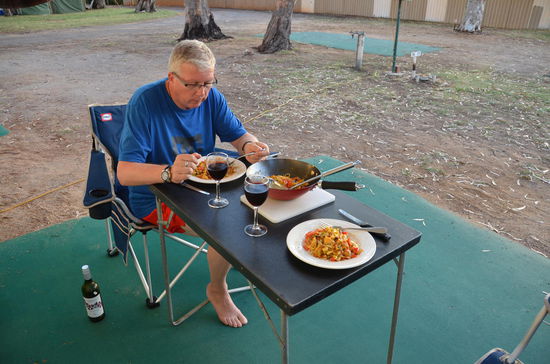 Danach gibt es einen gemütlichen Spätnachmittag. Jürg liest sich durch sämtliche Zeitungen und ich schreibe im Blog. In den Eukalyptusbäumen ist die Hölle los. Es hat riesige Schwärme von Rosakakadus und die machen einen Riesenlärm. Mal hat man eine Versammlung auf diesem Baum und alle schwirren lautstark auf die Äste, dann legt einer los und alle krächzen fröhlich mit. Danach fliegt einer weg und alle andern hinterher, so dass die wichtige Sitzung auf einem anderen Baum weitergehen kann. Es ist zu lustig!