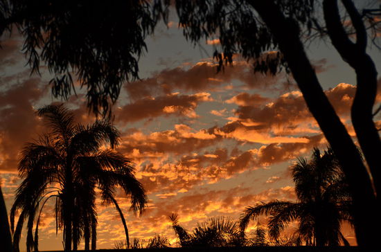 Dann geht die Sonne unter und verfärbt den Himmel wie in Cervantes in den unglaublichsten Farben. Die Schleierwolken wirken so kitschig, dass man das Gefühl hat eine billige Hawaii-Postkarte zu erblicken. Alles erscheint so unwirklich schön! Und ich bedaure zutiefst, dass wir viel zu weit vom Meer entfernt sind als dass sich ein Spaziergang dorthin lohnen würde. Doch es gibt ein paar schöne Fotos mit Palmen und einem unglaublichen Himmel. Ich liebe Sonnenuntergänge!