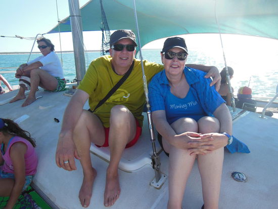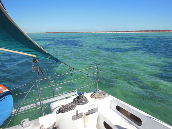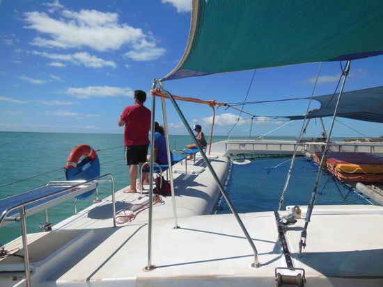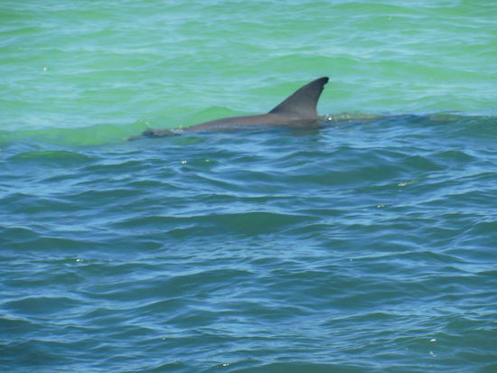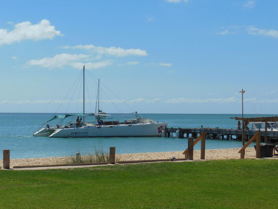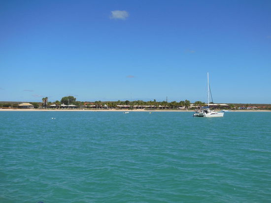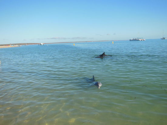 Um zwölf Uhr sind wir parat für unsere Wildlifetour und nach einer Viertelstunde dürfen wir auf den Katamaran. Katy ist unsere Reiseleiterin und Quinn unser Kapitän. Schon bald fahren wir gemütlich in die Shark Bay hinein und sitzen unter einem breiten Dach im Schatten am Heck. Die Shark Bay ist mit 10 000 km2 riesig und mit einer durchschnittlichen Tiefe von 9 - 10 Meter erstaunlich seicht. Da das Gebiet eine hohe zoologische Bedeutung hat, gehört sie zum Unesco Welterbe. Nebst vielen Delphinen leben in der Bucht vorallem Seekühe - oder Dugongs wie sie hier heissen, Meeresschildkröten, Rochen, Seeschlangen, Wale und gelegentlich auch Haie, was uns beim Namen der Bucht erstaunt. Nur gelegentlich?