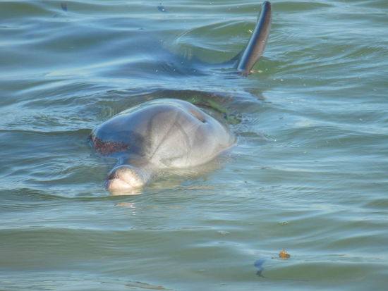 Wir beobachten gespannt das Meer und die Ranger laufen im knietiefen Wasser auf und ab. Und plötzlich erblicken wir die ersten Flossen! Wir dürfen uns nun an den Strand begeben und zwei Delphine schwimmen ganz langsam an uns vorbei. Manchmal halten sie und schauen uns direkt an. Es ist unglaublich! Die Rangerin erklärt uns, dass dies Nikki sei. Meistens sei sie die Erste und komme jeden Tag. Auch sie berührt den Delphin nicht, denn so könnte man Krankheiten übertragen. Weitere Delphine tauchen auf und sogar zwei Junge sind dabei. Es ist so schön!