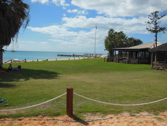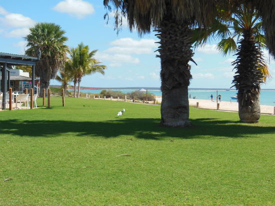 Um halb sieben sind wir bereits wach. Heute ist der grosse Tag, worauf wir uns schon lange freuen, die Begegnung mit den berühmten Delphinen von Monkey Mia. Um viertel nach sieben stehen wir mit vielen anderen am Strand und werden bereits von Rangern erwartet. Sie weisen uns zu einem Gebäude auf die hölzerne Ballustrade und dort müssen wir warten. Eine Dame weist uns in die Geschichte der Delphine hier ein. 1960 begannen Fischer die Delphine mit Fischabfällen zu füttern und diese schwammen pünktlich immer am Vormittag an den Strand um ihr Goudie zu kriegen. Daraus entstand irgendwann die ganze touristische Infrastruktur, die heute zu sehen ist.
