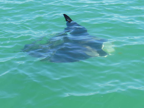 In einer ersten Bucht sichten wir mehrere Delphine und einen Riffhai. Dann beehrt uns eine Meeresschildkröte und als Höhepunkt ein riesiger Manta. In einer unglaublichen Eleganz schwimmt er neben unserem Schiff und posiert damit herrlich für uns Hobbyfotografen.