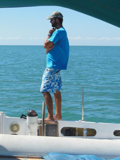 Wir staunen über die Tiefe des Wassers. Als ich den Kapitän mal frage wieviel Wasser wir denn unter dem Kiel hätten, meint er, ca. 1,5 Meter. Wow... dann könnte man ja zurück spazieren. Überhaupt hat der Kapitän auch eine einfallsreiche Methode um den Kat zu steuern. Er steht auf der Höhe des Steuers und steuert ... mit dem Fuss. Na ja, viel kann ja nicht schief gehen. Das Meer ist so ruhig wie in der Badewanne.