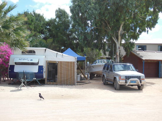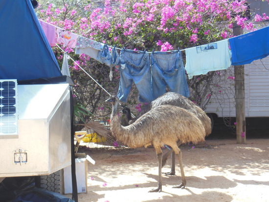 Am Abend sind wir nicht sonderlich hungrig. Ein Gurkensalat und Brot genügt uns. Dafür sind unsere Emus höchst aktiv und picken immer wieder frech aus Tellern, die grad nicht beaufsichtigt werden. Doch der Höhepunkt ihrer Dreistigkeit ist ein Besuch in einem Zelt, wo ein kleines Mädchen liegt. Ein Schrei hallt durch das Resort und der Emu erschreckt mindestens ebenso wie die Göre. Diese brüllt nun die ganze Familie zusammen und heult lautstark herum. Wir lachen uns krumm...