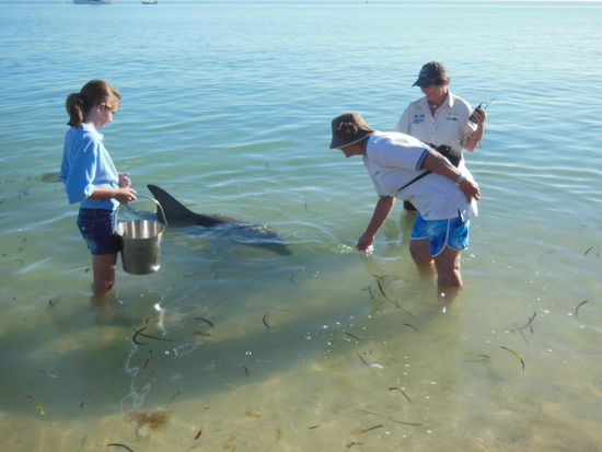 Die Delphine schwimmen auf und ab, halten manchmal an und wir können sie in Ruhe betrachten und natürlich fotographieren. Den Rangern darf man Fragen stellen, was natürlich ausgiebig genutzt wird. Plötzlich erscheinen Helfer mit 3 Eimern. In jedem Eimer befinden sich 3 Fische. Die Rangerin liest drei Touristen aus, die ins Wasser dürfen und dann erhält jeder Delphin seine Fischration. Die ist sehr klein, da die wilden Delphine ihr Futter selber jagen sollen. Wir geniessen den Anblick der wunderschönen Tiere. So lange und so nahe haben wir das noch nie erlebt. Als sie gefressen haben, schwimmen sie langsam wieder hinaus aufs Meer. Was für ein Erlebnis! Die tollen Tiere haben uns völlig in ihren Bann gezogen!