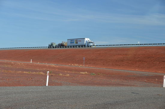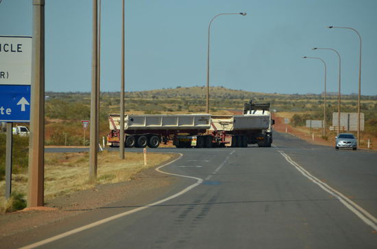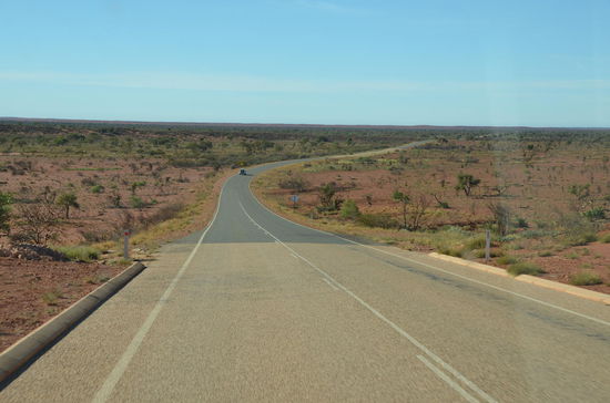 Wir fahren weiter. Noch haben wir 150 Kilometer bis Karratah vor uns. Weiterhin fahren alle Verkehrsteilnehmer äusserst rücksichtsvoll und wir fühlen uns zwischen den Roadtrains wie eingebettet. Wir erreichen langgezogene Grasprärien und immer wieder Abzweigungen zu grossen Minen oder gasfördernden Industrien. Dies erklärt auch die zahlreichen Roadtrains, die uns begleiten.