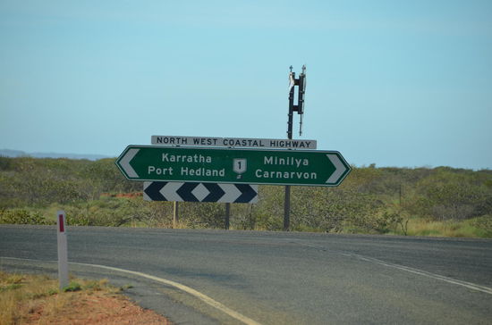 Durch eine endlose Weite, mal übersät mit Büschen und Termitenhügeln, mal durchzogen mit Eukalyptusbäumen und Büschen, bewohnt von Emus, gelangen wir nach 140 Kilometern wieder auf den North West Coastal Highway. Auch einige einsame Farmen sind uns begegnet und wir fragen uns, wie es wohl ist so weitab von jeder grösseren Stadt zu leben.