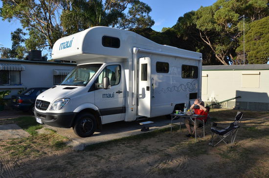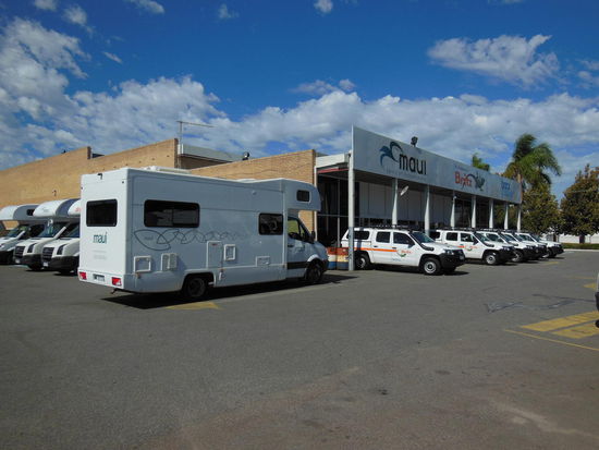 Bei MAUI werden wir auf Deutsch begrüsst. Nachdem die Formalitäten erledigt sind, erhalten wir einen DVD-Player, wo wir alles wichtige über unser neues Heim erfahren. Dann zeigt uns ein anderer Herr unser Fahrzeug. Es ist nicht mehr das Neuste, hat schon fast 100 000 km auf dem Buckel, doch alles sieht sauber aus. Wir schauen uns auch aussen rum alles an und erkundigen uns, ob wir jeden Kratzer jetzt dokumentieren sollen. Doch der nette Herr winkt ab und meint australisch cool, wir wären ja für alles versichert. Mache also keinen Sinn. Nach unsere Erfahrungen in Las Vegas sind wir zwar ein wenig misstrauisch, doch belassen es dabei.