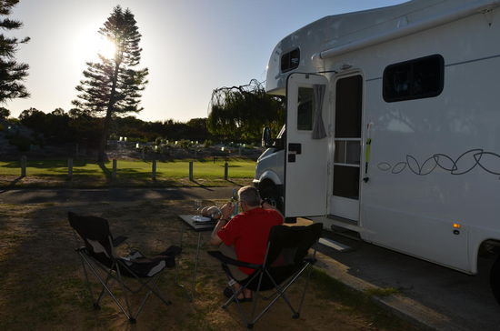 Dann kehren wir zurück zum Camper, machen uns ein kleines Abendessen in Form von Schinkenbrötchen und einem Glas Sauvignon Blanc und erfreuen uns der Tatsache, dass die Höhe des Campingtisches mit der Höhe der Campingstühle um Welten variert. Wenn wir sitzen, könnten wir direkt vom Teller essen ohne uns vorzubeugen. Doch das nehmen wir locker: Improvisieren wird zu einem Hobby werden... Zudem ist der eine Campingstuhl schon defekt. Super...