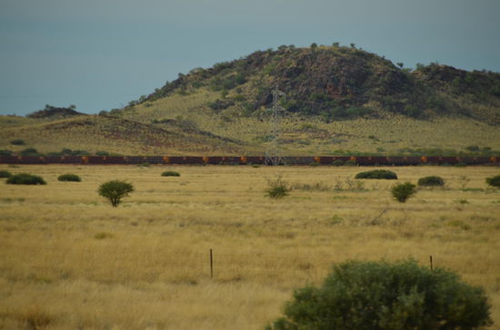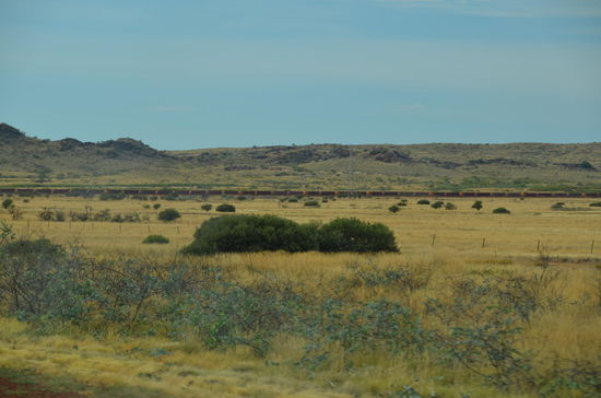 Auf dem Weg nach Port Hedland begleiten uns viele Roadtrains. Karratah wie Port Hedland sind die australischen Haupsstädte der riesigen Erzvorkommen und entsprechend ist das Verkehrsaufkommen von Lastwagen und Minenfahrzeugen mit Warnblinkanlagen auf dem Dach. Die Landschaft ist abwechslungsreich. Zuerst durchfahren wir eine riesige Ebene mit gelbem Präriegras, dann gehts wieder durch malerisches Berggebiet bis wir wieder eine endlose Ebene mit Büschen und Eukalyptusbäumen erreichen.