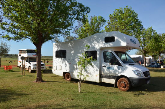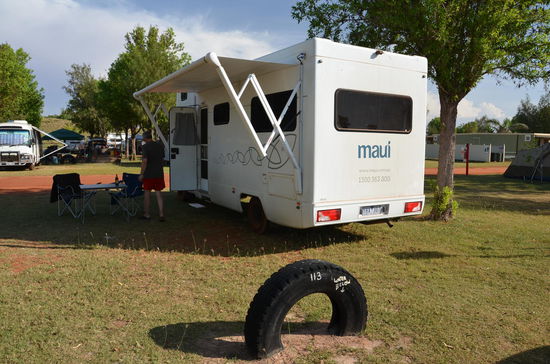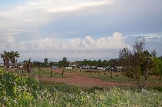 Endlich erreichen wir den Caravanpark und erhalten hinter einer hohen Düne einen schönen Standplatz. Auch hier ist es drückend heiss, doch am Horizont ballen sich gewaltige Gewitterwolken zusammen und wir befürchten, dass sich da was zusammenbraut.