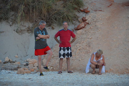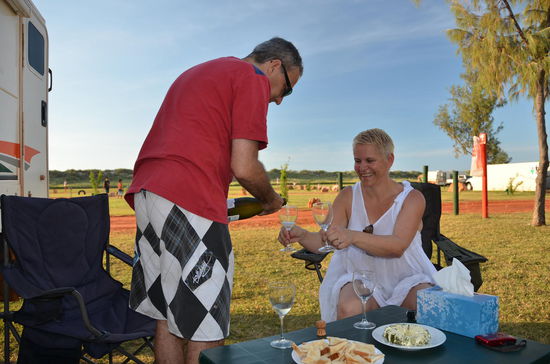 Unser heutiges Ziel ist der Eighty Mile Beach, ein einsamer Caravanpark zwischen den 600 Kilometern zwischen Port Hedland und Broome. Wir erreichen ein letztes Roadhouse, wo wir nocheinmal auftanken. Als wir gerade zahlen wollen, winken uns zwei Leute aus dem danebenliegenden Restaurant und wir staunen nicht schlecht, als wir Irene und Richi sehen. Auch sie sind auf dem Weg zum Eighty Mile Beach. So setzen wir uns zu ihnen, geniessen eine Portion Fritten und plaudern, was wir bis jetzt wieder alles erlebt haben. Irene hatte gestern Geburtstag. Sie kauft eine Flasche Wein und meint, dass das Apéro diesen Abend bei ihnen stattfinden würde. Die Einladung nehmen wir gerne an.