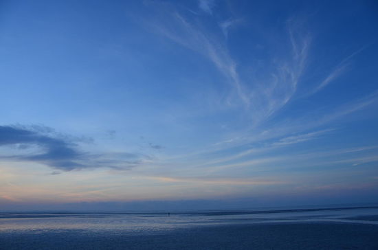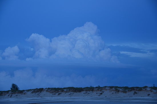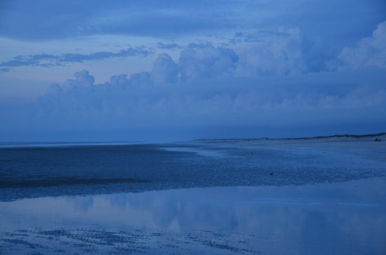 Danach begeben wir uns gemeinsam an den Strand um den Sonnenuntergang zu erleben. Leider verdecken Wolken die Sonne. Doch der Strand ist äusserst eindrücklich, ein grosser Teil des Bodens ist mit Muscheln bedeckt und um ans Wasser zu gelangen, müsste man fast 500 Meter laufen. Die Ebbe zeigt das ganze Ausmass des flach abfallenden Strandes. Irgendwie erinnert alles ein wenig an die Nordsee und nicht an eine tropische Küste. Am nördlichen Horizont schwärzt sich der Himmel und riesige weisse Kumuluswolken wachsen beeindruckend in den Himmel. Wir ahnen schlimmes.
