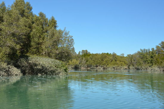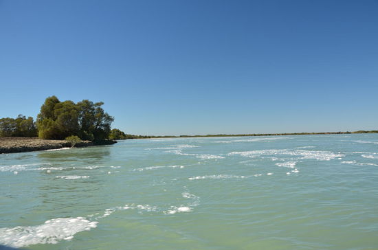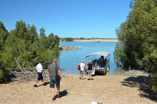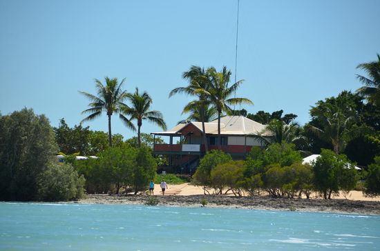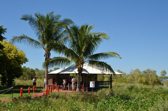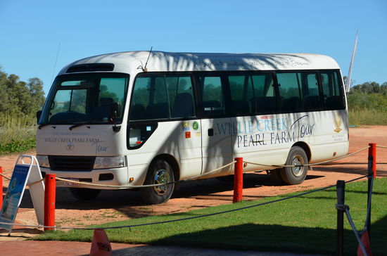 Schon bald biegen wir von der geteerten Hauptstrasse auf eine unbefestigte Nebenstrasse ab. Der ältere Chauffeur hat die sandige Piste erstaunlich gut im Griff, muss er auch! Er fährt als ob der Teufel hinter ihm her wäre... Um neun Uhr erreichen wir Willie Creeks Pearl Farm. Ich staune nicht schlecht. Im Internet war eine Luftaufnahme und die zeigte, dass sich die Farm direkt am Meer befindet. Davon sehe ich aber nichts, nur ein weitere entfernter Fluss ist zu erkennen. Komisch...
