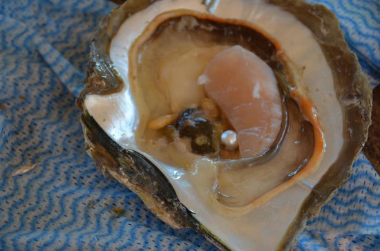 Wir werden vom schönen Hauptgebäude weg zu einem offenen Chalet geführt. Dort erhalten wir Unterricht in Perlenzucht. Ein jüngerer Mann, der sich als Engländer outet, erklärt uns alles notwendige. Dank diesem europäischen Akzent verstehen wir relativ viel und finden den Unterricht sehr interessant. Er zeigt uns verschiedene Austern, erklärt wie man die Austern "schwängert" und wie lange es dauert bis die Austern im Meer wunderschöne Perlen hervorbringen. Aber nicht nur die Perlen werden verwendet. Die Austern bestehen innen aus wunderschönem Perlmut und das wird in vielen Produkten des täglichen Bedarfs gebraucht. Da wären nur schon Autos mit einer Perlmut-Lackierung.