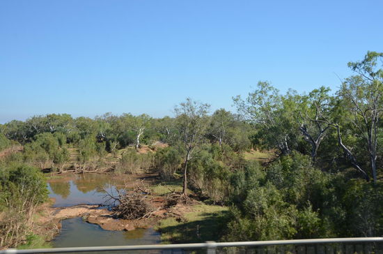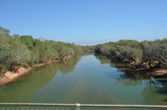 Heute steht unser längster Törn an: ganze 700 Kilometer ins Nowhere vom australischen Outback. Um viertel vor sechs bin ich bereits wach und es zeigt sich, dass wir in der Zwischenzeit zu einem eingespielten Team wurden. Jeder Handgriff sitzt, das Bett ist schnell gemacht, das Frühstück aufgetischt und wieder abgeräumt, alles an seinen Platz versorgt, der Camper abfahrtsbereit. Um sieben Uhr verlassen wir Broome und fahren auf dem Great Northern Highway ostwärts weiter. Nach der Trockenheit der letzten tausend Kilometer, staunen wir über Flüsse, die wir überqueren.