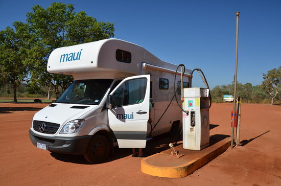 Wir erreichen Fitzroy Crossing, ein einsames Städtchen im Nichts. Wer hier lebt, ist wahrlich am Ar... der Welt. Immerhin hat es eine Tankstelle mit einem Imbiss. Wir tanken auf und schauen uns dann noch ein wenig im Shop um. Es hat viele Aborigines, die hier ihr Mittagessen kaufen und es draussen dann in einem kleinen Park in Gruppen essen. Der Imbiss ist in asiatischer Hand und auch wir kaufen uns Chicken Wings mit Chips. Mit dem Camper fahren wir ein wenig aus Fitzroy Crossing hinaus und finden einen schattigen Platz am Strassenrand, wo wir essen. Es schmeckt fürchterlich und so schmeissen wir mehr als die Hälfte weg und verdrücken lieber einen Schokoladenriegel.