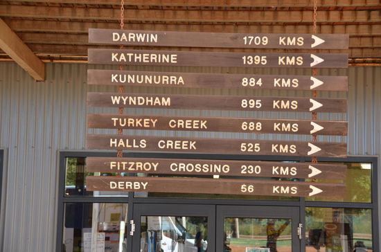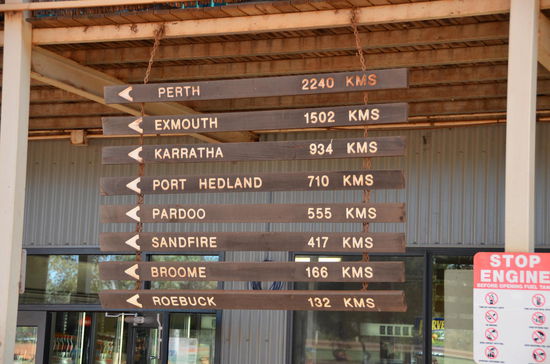 Nach 166 Kilometer eintöniger Fahrt erreichen wir das Willare Bridge Roadhouse, wo wir unser Gefährt auftanken und zwei drei Lebensmittel einkaufen. Mehrere Schilder zeigen uns die Entfernungen zu anderen australischen Städten und sie sind höchst beeindruckend: Perth 2240 Kilometer und unser Ziel Darwin 1709 km. Da haben wir ja noch eine schöne Strecke vor uns...