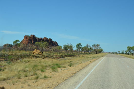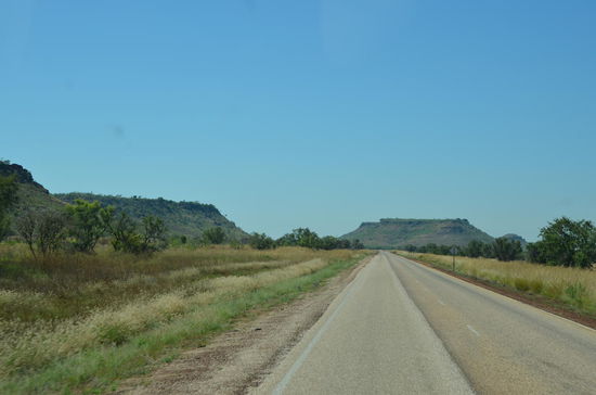 Ab Willare darf ich das Steuer übernehmen. Plötzlich überqueren wir einen breiten Fluss, den Fitzroy River und erreichen die Abzweigung nach Derby, einem der grösseren Städte hier im Norden Australiens. Doch unser Weg führt nicht dorthin und geht weiter auf dem Great Northern Highway. Die Landschaft ändert sich. Ab und zu erblicken wir einsame Tafelberge, was fürs Auge eine willkommende Abwechslung ist. Auch Kühe - tote und lebendige - sorgen für Unterhaltung. Doch der Höhepunkt sind Kängurus. Manche hüpfen locker der Strasse entlang und manche überqueren munter vor uns den Highway. Da wir keines überfahren wollen, bedarf es trotz einsamer Strasse erhöhter Aufmerksamkeit.